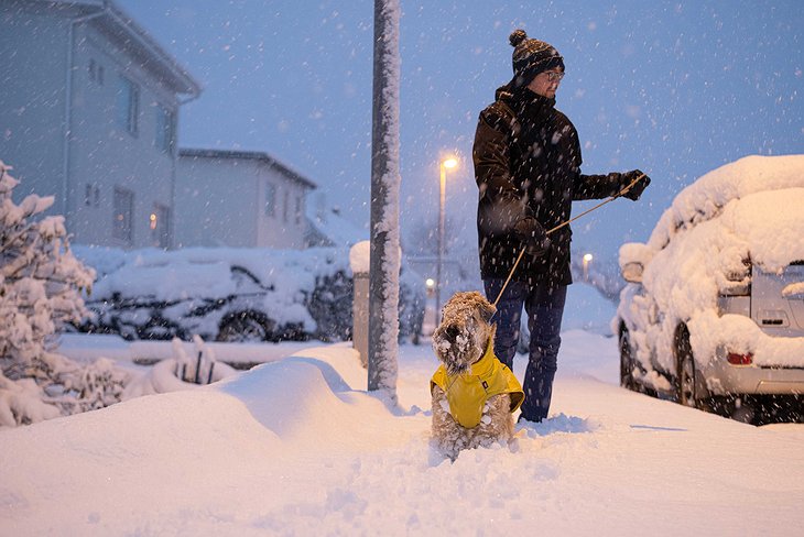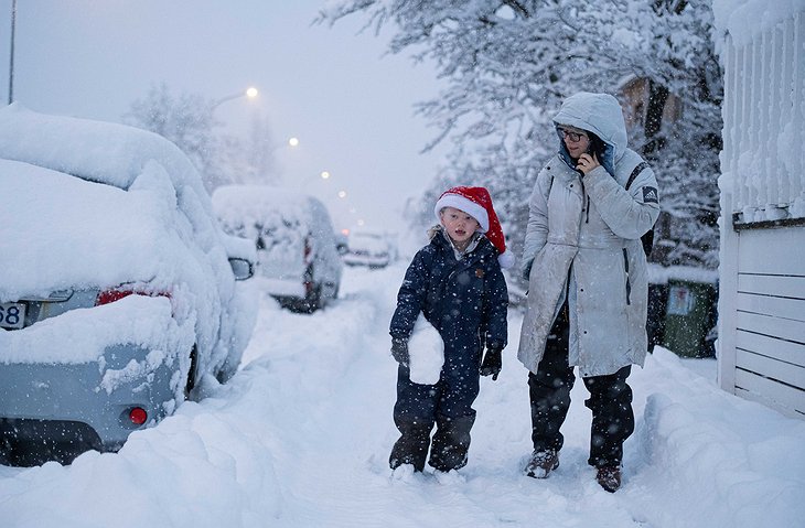 Enn eru vetrarfrí í grunnskólum í Reykjavík og léttir það á umferð upp að einhverju marki. Úlfhéðinn Ullur Jónþórsson er einn þeirra nemenda sem eru í fríi í dag og hafði hann sett upp jólasveinahúfu áður en hann arkaði af stað út í bakarí í snjónum. „Hvað gerir maður á svona vetrarmorgni?“ sagði mamma hans Elísabet Stefánsdóttir og hló.