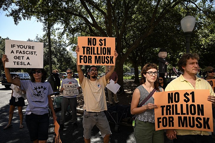 Mótmælendur gegn Musk skipuleggja mótmæli fyrir utan risaverksmiðju Tesla þann dag, eftir mótmælafund gegn Musk í miðbæ Austin á miðvikudag.