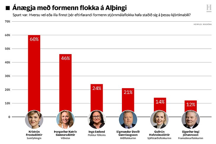 Formenn ríkisstjórnarflokkana sitja í þremur efstu sætunum. 46 prósent svarenda könnunarinnar telja Þorgerði Katrínu Gunnarsdóttur, formanns Viðreisnar, hafa staðið sig vel það sem af er kjörtímabili. 24 prósent eru ánægðir með störf Ingu Sæland, formanns Flokks Fólksins. Sigmundur Davíð Gunnlaugsson er hæstur formanna flokka sem eru í stjórnarandstöðu og mælist með 21 prósent. Nýr formaður Sjálfstæðisflokksins, Guðrún Hafsteins, er í næst síðasta sæti með 14 prósent.
