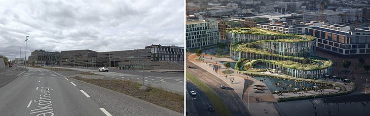 Í miðbænum sem flestir þekkja eru líka teknar ákvarðanir sem skipta okkur máli. Á einum mikilvægasta reit borgarinnar, sem er gegnt Arnarhóli og við hliðina á Hörpu, var tekin ákvörðun um byggingu fyrir nokkrum árum. Til vinstri er gráa ákvörðunin af húsinu sem var byggt, Hús Landsbankans á Reykjastræti frá ja.is, og til hægri er sami staður með grænu ákvörðuninni sem var ekki tekin, en það var tillaga að nýbyggingu sem ekki bar sigur úr býtum, frá arkitektum frá Bjarke Ingels Group í Danmörku ásamt Arkíteó, DLD og Andra Snæ Magnasyni. Andri Snær hefur gagnrýnt slíkar ákvarðanir og með nýrri bók sinni, Jötunsteini, opnar hann inn á heita umræðu um fegurð í borg sem virðist vera hverfandi. Áberandi munur á milli þessara tveggja mynda er að grátt steypuumhverfið ríkir í borgarmyndinni en græna lífið er hvergi.