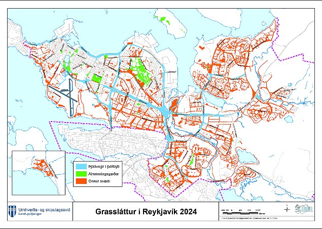 Í borginni eru hins vegar almenningsgarðar að hverfa úr borgarmyndinni og eru ekki lengur borgarprýði á mörgum nýjum svæðum. Kortasjá Reykjavíkurborgar sýnir þetta glöggt og einnig má sjá svæði þar sem gras er slegið. Grassláttur í Reykjavík árið 2024 fór fram á 10.802 sláttusvæðum og alls voru slegnir 473 hektarar af grasi það sumarið eða 4,73 km2. Af hverju allan þennan grasslátt? Slegnar grasflatir eru líffræðilegar eyðimerkur, a.m.k. þegar margar þeirra gætu verið með fjölbreyttum gróðri og verið skjól fyrir alls kyns aðrar lífverur.