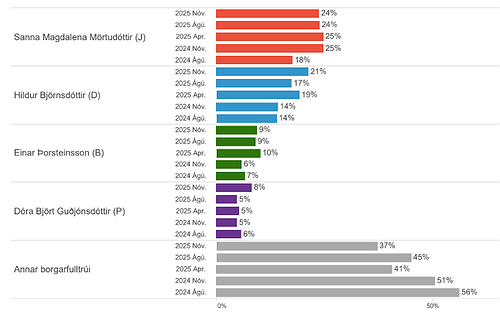 Í könnuninni velur fjórðungur, eða 24% Sönnu Magdalenu, sem er svipað og síðasta ár. Næst flestir, eða 21%, velja Hildi Björnsdóttur, borgarfulltrúa Sjálfstæðisflokksins, og hækkar hún úr 17% frá því í ágúst og úr 14% fyrir ári.