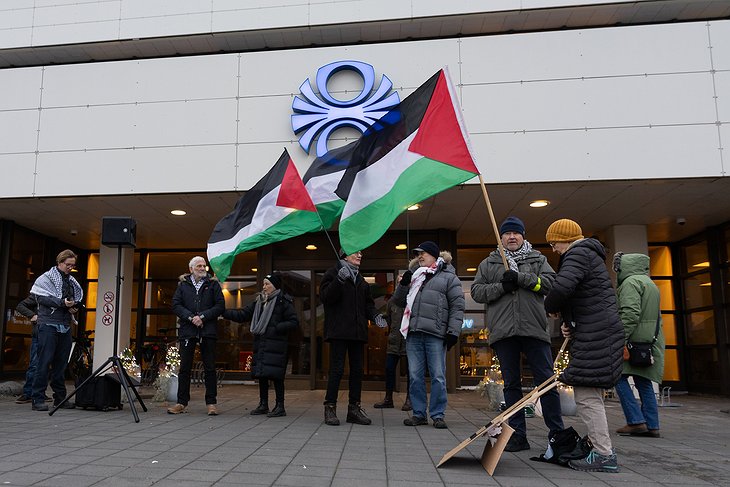 Fjöldi mótmælenda er saman kominn fyrir utan Ríkisútvarpið í Efstaleiti undir nafninu „Kveðjum Júróvisjón“. Vilja þeir að Ísland sniðgangi Eurovision í Austurríki næsta vor vegna framgöngu Ísraels í Palestínu.