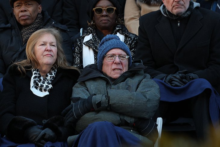 Bernie SandersÖldungadeildarþingmaðurinn frá Vermont, Bernie Sanders, sótti embættistökuna ásamt eiginkonu sinni Jane Sanders, í kuldanum í New York í gær.