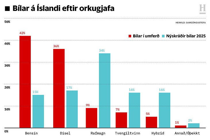 Aðra sögu er að segja á Íslandi, þar sem rafbílar voru í minnihluta nýskráðra bifreiða 2025. Aðeins 34% nýskráðra bíla á Íslandi 2025 voru hreinir rafmagnsbílar. Í Evrópusambandinu var sama hlutfall komið í 21% í nóvember.