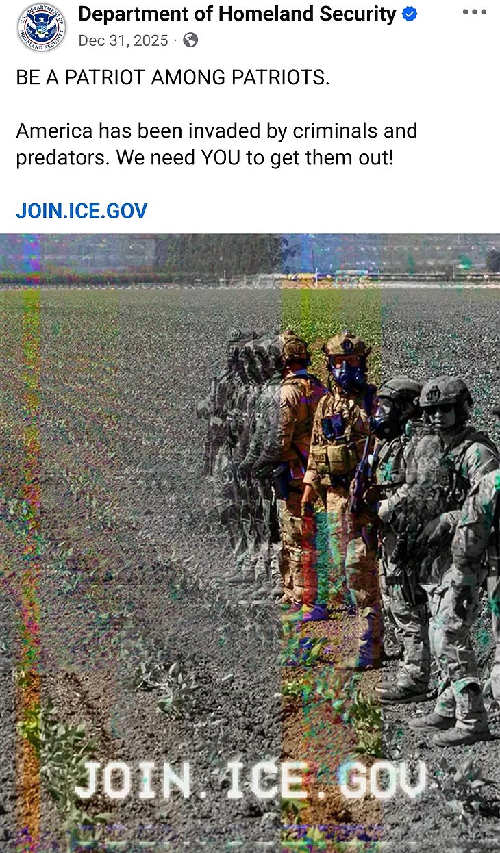 Sama dag birti það mynd af vopnuðum mönnum við vefslóð að umsóknarvef fyrir ICE: „Verið föðurlandsvinir meðal föðurlandsvina. Bandaríkin urðu fyrir innrás glæpamanna og rándýra. Við þurfum ÞIG til að koma þeim út!“