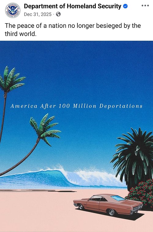 „Bandaríkin eftir 100 milljón brottvísanir,“ sagði í færslu Heimavarnaráðuneytisins á gamlársdag við mynd gömlum lúxusbíl á ströndinni við textann: