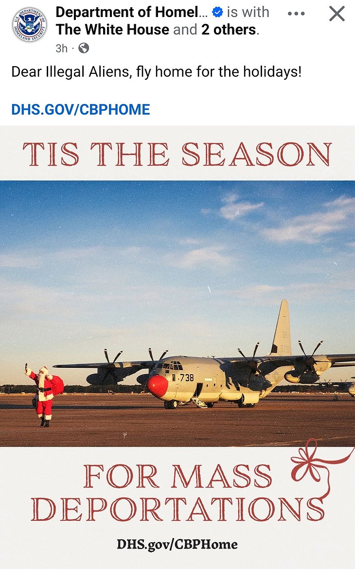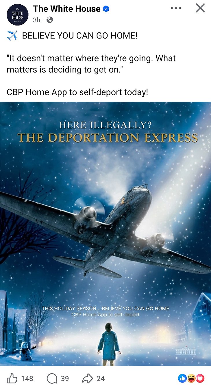 Hvíta húsið setti út kvikmyndaplakat með tilvísun í jólamyndina The Polar Express. „Trúðu því að þú getir farið heim!“ sagði þar undir titlinum Brottvísanalestin. „Það skiptir ekki máli hvert þú ert að fara. Það skiptir máli að fara um borð“.