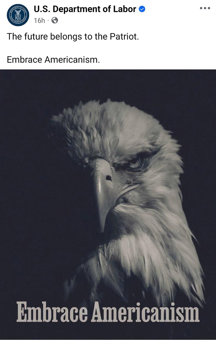 „Framtíðin tilheyrir föðurlandsvininum. Umfaðmaðu ameríkanisma,“ segir ráðuneytið annars staðar.