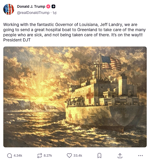Trump vakti undrun þegar hann fullyrti á samfélagsmiðli sínum Truth Social að hann hefði ákveðið að senda sjúkraskip til Grænlands til þess að veita landsmönnum lækningu. Bæði stjórnvöld í Danmörku og Grænlandi afþökkuðu, enda byggju Grænlendingar að gjaldfrjálsri heilbrigðisþjónustu, en óljóst er hvort nokkurt raunverulegt skip var til reiðu í verkefnið.