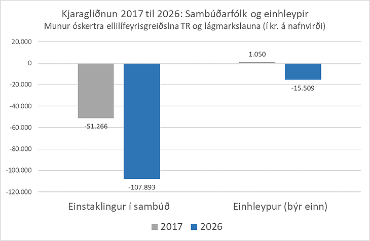 Lífeyrir sambúðarfólks með engar eða litlar aðrar tekjur en frá almannatryggingum var um 51 þúsund krónum undir lágmarkslaunum árið 2017 en fór niður í tæpar 108 þúsund krónur undir lágmarkslaunum 2026. Bilið milli þess lífeyris og lágmarkslauna ríflega tvöfaldaðist. Það er mikið á alla mælikvarða.