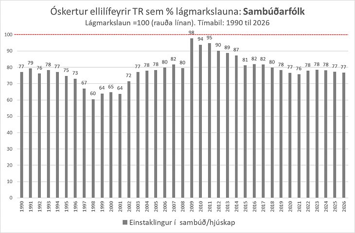 Eitt sem rétt er að velta upp í þessu samhengi er hvort of mikill munur sé á afkomutryggingu almannatrygginga (óskertum elli- og örorkulífeyri TR) milli einhleypra og sambúðarfólks. Flest árin á tímabilinmu 1990 til 2026 hefur grunnlífeyririnn (án heimilisuppbótarinnar) verið undir 80% af heildarlífeyri einhleypra. Það er lágt. Algengt er að hlutfall grunnlífeyris sambúðarfólks sé nær 90% af lífeyri einhleypra. Þannig er það t.d. í Svíþjóð og einnig í Ástralíu sem býr við svipað tekjutengingakerfi almannatrygginga og Ísland.