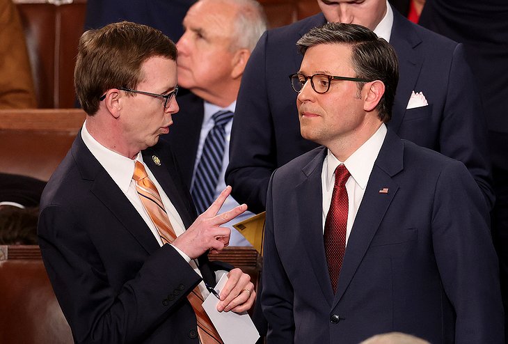 Andmúslímsk viðhorfMike Johnson, forseti fulltrúadeildar Bandaríkjaþings, ræðir við Andy Ogles í þinghúsinu í Washington, DC, þann 3. janúar 2025.