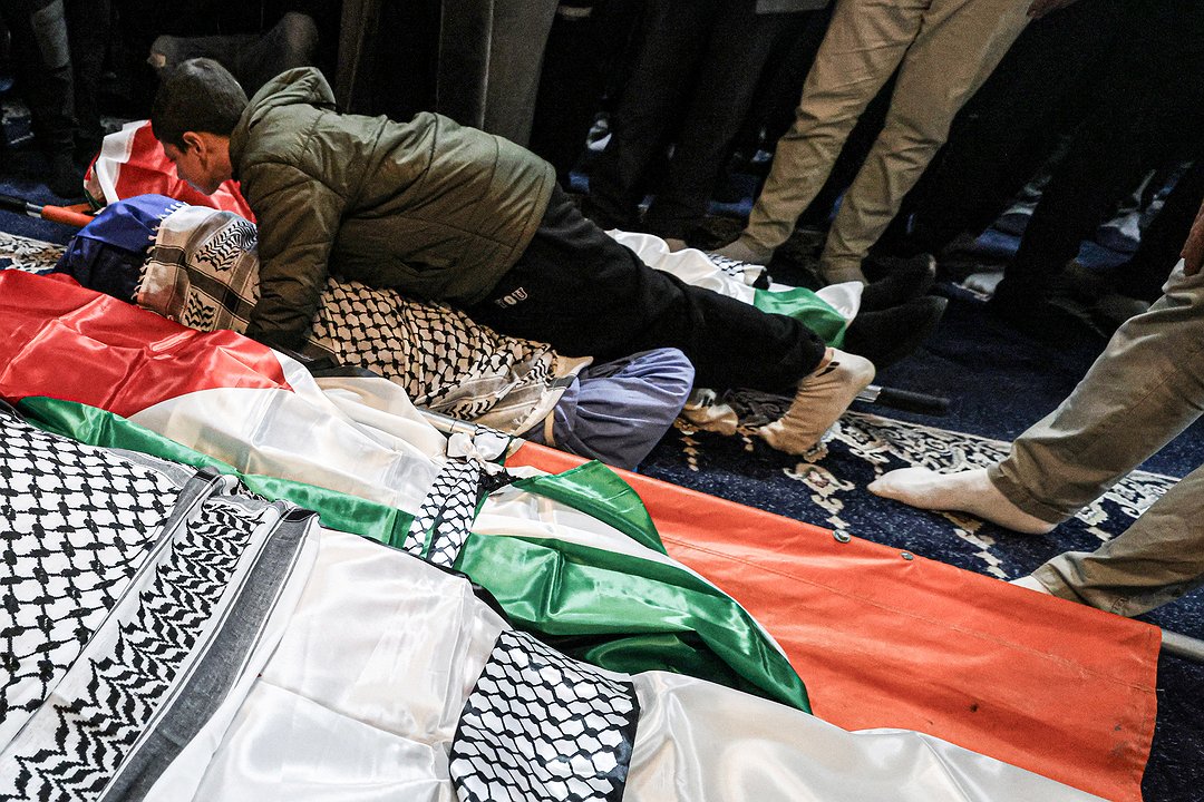 Sorgmæddir Palestínumenn grétu yfir líkum fjögurra fjölskyldumeðlima, þar á meðal tveggja barna, sem palestínska heilbrigðisráðuneytið sagði að hefðu verið skotin til bana fyrr í dag af ísraelskum hersveitum á hernumda Vesturbakkanum.