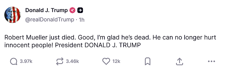 Trump brást skjótt við á Truth Social og skrifaði: „Robert Mueller er nýlátinn. Gott, ég er ánægður með að hann er dáinn. Hann getur ekki lengur skaðað saklaust fólk!“