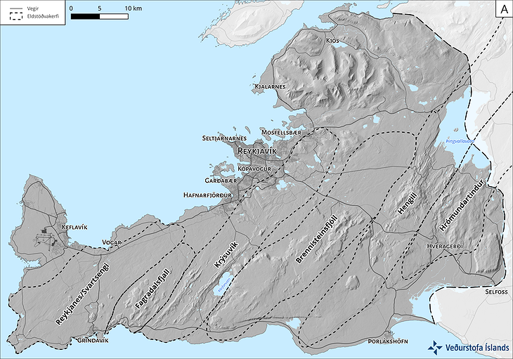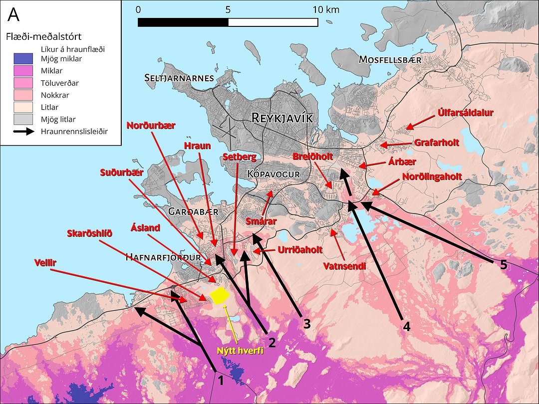 Þannig nær svæði, sem skilgreint er mögulegt gosupptakasvæði, alla leið undir Fella- og Hólahverfið í Breiðholti, þótt litlar líkur séu á gosupptökum, sem fyrr segir.