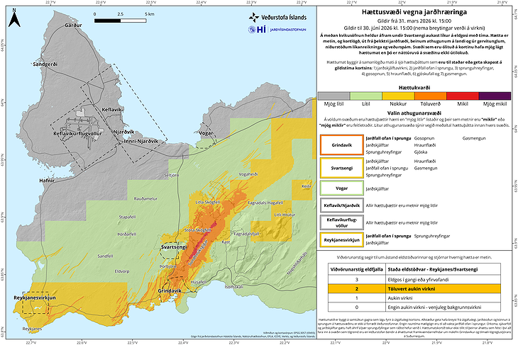 Viðvörunarstig eldfjalla á Sundhnúkagígaröðinni stendur núna í 2, sem merkir „töluvert aukna virkni“, en fari það í 3 er „eldgos í gangi eða yfirvofandi“. Fyrirvari fyrir eldgos á svæðinu hafa verið frá um hálftíma upp í 90 mínútur.