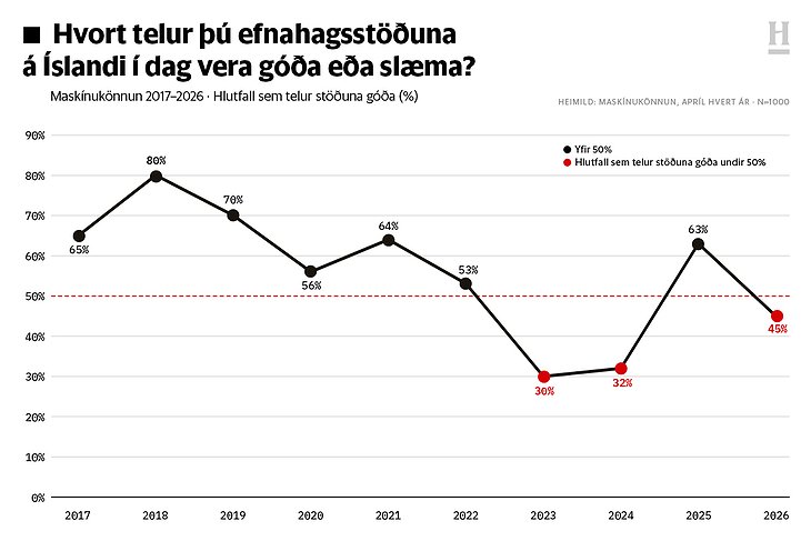 Rúmlega helmingur Íslendinga telur efnahagsstöðuna slæma. Viðsnúningur hefur orðið á afstöðu þjóðarinnar á skömmum tíma. Þetta kemur fram í niðurstöðum nýrrar könnunar Maskínu. Alls telja 55 prósent þjóðarinnar efnahagsstöðuna slæma, en í apríl fyrir ári síðan var hlutfallið 38 prósent.